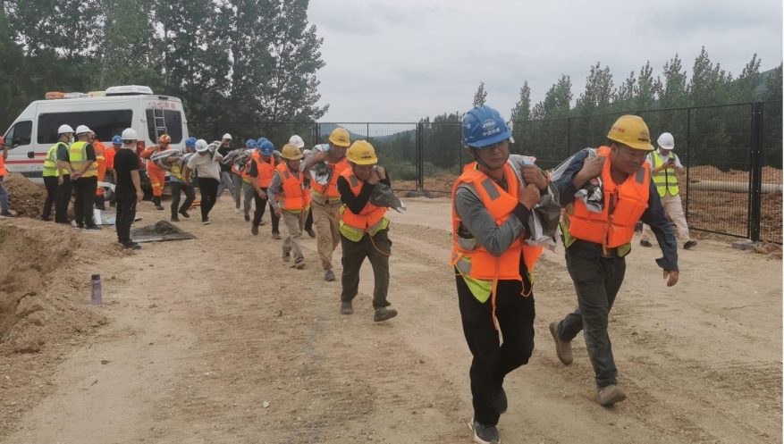 演练模拟因持续强降雨导致矿区水位急剧上涨,洪水即将漫入矿山办公区域的紧急场景。险情发生后,矿山公司立即启动防汛应急预案。各应急小组接到指令后迅速响应,第一时间集结并赶赴现场。经过抢险人员约30分钟的奋力抢险,险情得到有效控制,成功保障了公司财产安全,演练设定的各项任务目标圆满完成。