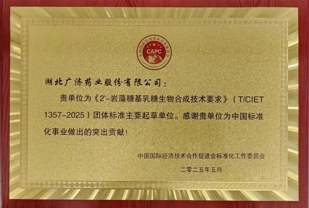 近日,由广济药业参与完成的《2'-岩藻糖基乳糖生物合成技术要求》(标准编号:T/CIET 1357-2025)团体标准经中国国际经济技术合作促进会标准化工作委员会专家严格评审后正式发布。作为该标准的主要起草单位,广济药业成功完成该团体标准的编制工作,标志着其在人乳寡糖生物合成技术规范标准化建设方面取得重要突破。