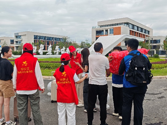 进入校园正门,“新生家长车辆由此直行”“迎新报到点由此进”等指引标语清晰醒目,直观勾画校园动线。身着制服的保安人员站姿挺拔,耐心指引车辆停靠;身旁的志愿者们主动为新生及家长答疑引路,一“站”一“引”之间,让校园车流、人流井然有序。考虑到新生携带行李较多,校区贴心调配接驳车帮助托运行李,可直达宿舍,顺利打通新生从“到校”到“入住”的最后一公里,让便捷与温暖一路相伴。