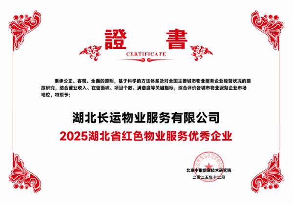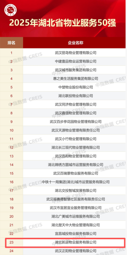 本次获奖,充分展现长运物业整体实力与服务成效。公司不仅获评“2025湖北省红色物业服务优秀企业”,同时荣登“2025年湖北省物业服务50强”榜单,在公建物业领域中获“2025武汉公建物业十大品牌物业服务企业”。