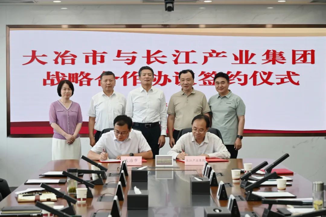 7月9日,长江产业集团与大冶市政府签订战略合作协议。集团党委副书记、总经理周勇士,大冶市委书记孙辄,市委副书记、市长潘小进出席活动并见证签约。集团运营总监杜三湖,大冶市副市长吴飞代表双方签约。大冶市委常委、常务副市长杨早容、市高新区管委会副主任李杰,集团财务总监陈华军参加活动。