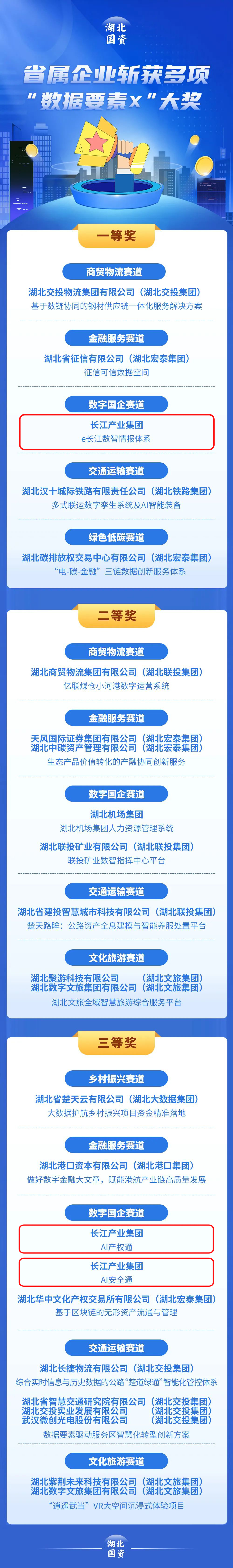 近日,湖北省政府国资委公布了省属企业斩获2025年“数据要素×”大奖名单,长江产业集团荣获1个一等奖,2个三等奖。