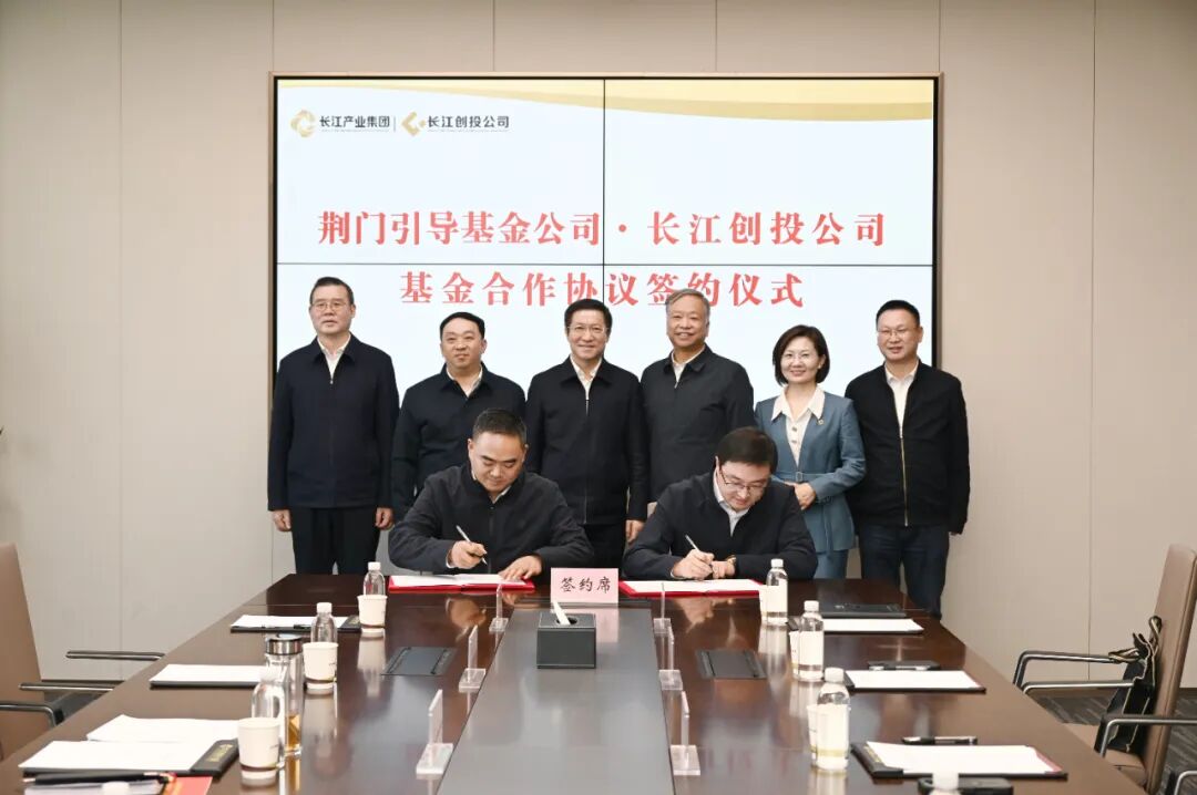 荆门市投资引导基金有限公司董事长、总经理李国强与长江创业投资基金管理有限公司副总经理李鄂代表双方签署基金合作协议。